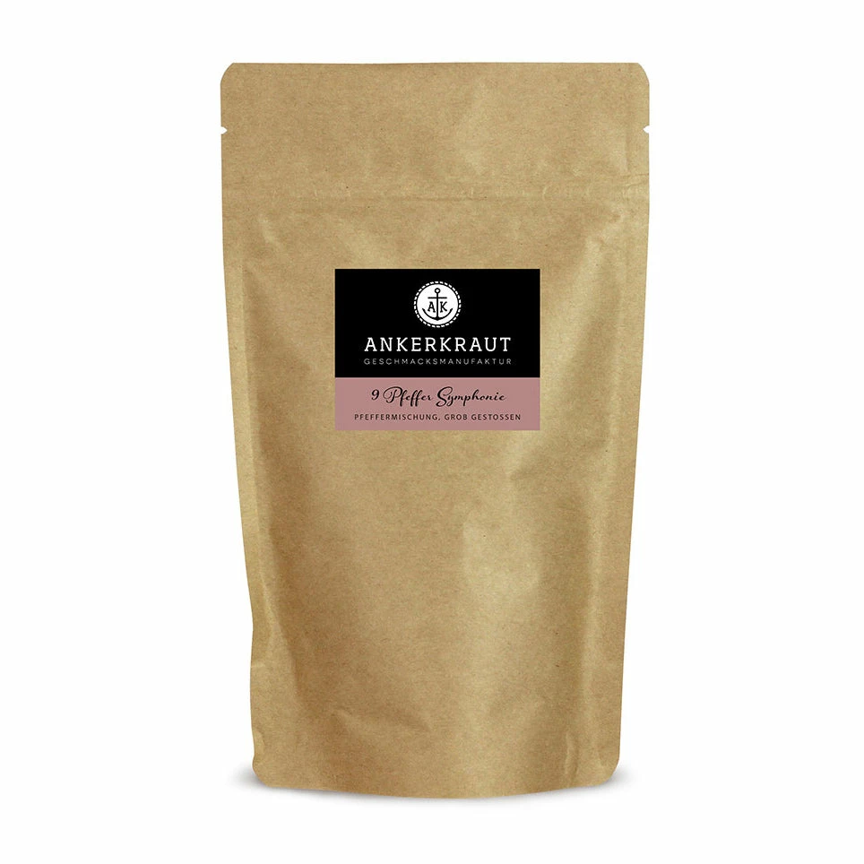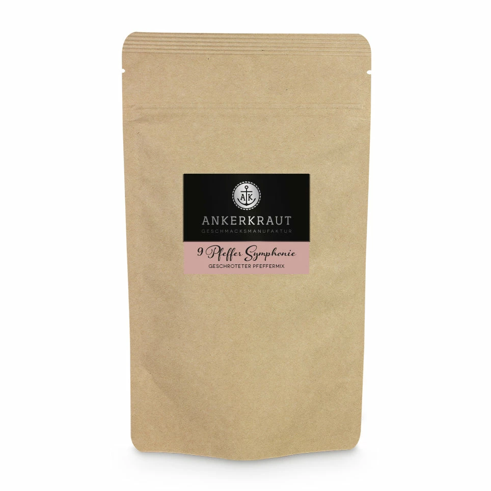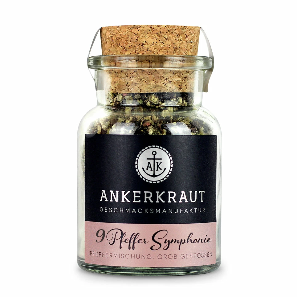 Um es in den Worten eines Gewürz-Virtuosen zu sagen: Das Zusammenspiel von grünem, schwarzem und weißem Pfeffer harmoniert auf den Punkt. Roter und schwarzer Kampot und Tellicherry Pfeffer spielen die 1. Geige und finalisieren mit Hilfe von Rosa Beeren, langem Pfeffer, Kubebenpfeffer, Piment und Szechuanpfeffer das perfektionierte Zusammenspiel am Gaumen. Na? Lust bekommen? Dann order dir die einzigartige 9-Pfeffer-Mischung die es so nur bei Ankerkraut gibt und gebe sie zum Fisch, Fleisch, Gemüse oder wie unsere Grafikerin sogar ins Müsli.