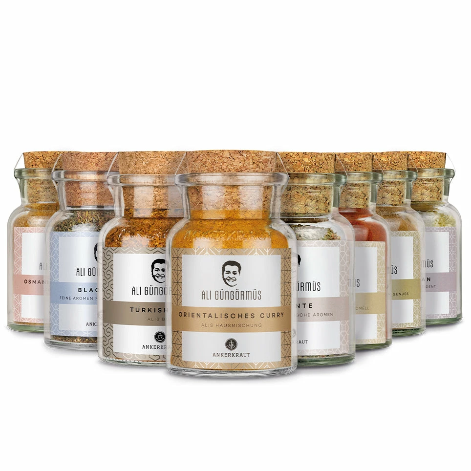 Ob als kulinarischer Türkei-Urlaub oder für Gerichte der Heimatküche, mit Ali Güngörmüs‘ Gewürzen bist du perfekt ausgestattet! Ali kam mit 10 Jahren aus der Türkei nach Deutschland – und ist heute renommierter Sternekoch, spezialisiert auf die orientalische Küche. Da müssen natürlich die richtigen Gewürze her! Mit diesem Set aus ALLEN Ali Güngörmüs Gewürzen bekommst du ACHT Korkengläschen voll türkischer Aromen. Da kommt Urlaub – oder Heimat – in BIO-Qualität an Reis, Gemüse, Lamm und mehr … und somit auf deinen Teller!