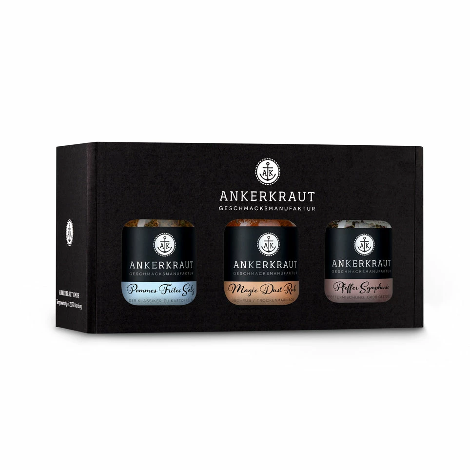 Drei tolle Ankerkraut Gewürze auf einen Streich! Mit dieser Box bekommst du die volle Breite an Geschmack, die jede Langeweile vom Teller vertreibt. Unser Pommes Salz würzt viele Kartoffelgerichte auf ein neues Level. Magic Dust, unser Haus-Rub und Bestseller, darf bei keinem Grillen fehlen und Pfeffer Symphonie… das sagt schon der Name. Die bis zur Perfektion arrangierte Pfeffermischung veredelt Gemüse, Fleisch und Fisch.