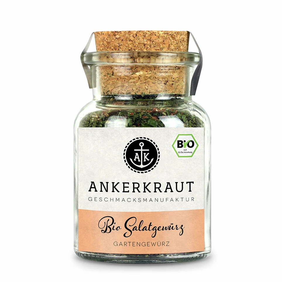 Salatköpfe müssen sich immer wieder mit Sprüchen wie „Salat kann man nicht grillen“ oder „Von Salat schrumpft der Bizeps“ herumärgern. Dabei ist (fast) nichts so wandelbar und vielfältig einsetzbar wie Salat. Die Königsdisziplin ist die Zubereitung des richtigen Dressings. Kaufen oder selbst anrühren? Pflicht oder Kür? Wir liefern dir Bio Salatgewürz Gartenkräuter mit Allrounderfunktion für leckeren, frischen und knackigen Salat. Einfach 1 bis 2 TL Gewürz mit Essig, Wasser und Olivenöl vermischen. Probiere auch mal Senf, Honig oder frische Gartenkräuter aus!