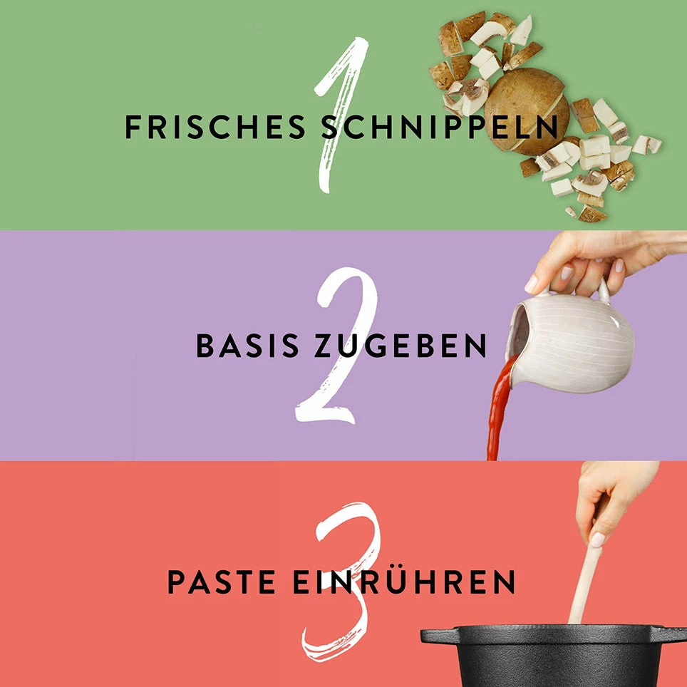 Nach Omas Traditionsrezept muss das Gulasch ganz schön lange einkochen… doch der Hunger kann so lange nicht warten und das Bauchgrummeln scheint einen schon nahezu anzubrüllen. Wie gut, dass sich ein authentisches Gulasch auch easy peasy mit unserer Würzpaste zubereiten lässt! Im Gläschen haben wir dir die wichtigsten Zutaten für eine herzhafte Gulasch-Soße zusammengestellt – frisch, frei von Schnickschnack und fertig zum Loslegen! Ingwer, Limettensaft, Paprika, Lorbeer & Co. verleihen deinem Fleischeintopf ein unvergleichliches Aroma in kürzester Zeit. Und das wie gewohnt natürlich unter Verzicht auf Geschmacksverstärker und sonstige.