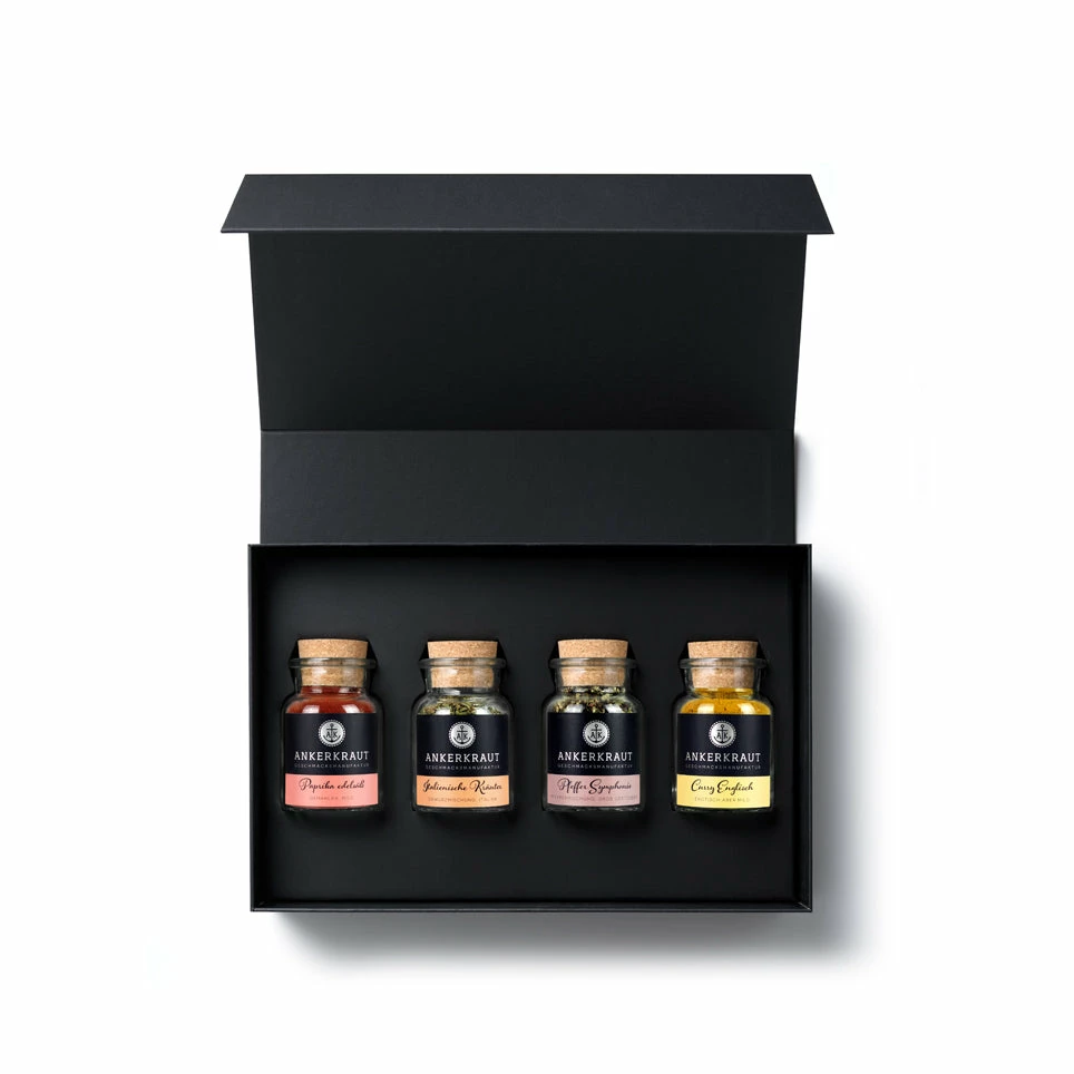 Manchmal steht man einfach auf dem Schlauch wenn es um Geschenke geht. Das wollen wir nicht und deshalb liefern wir dir Geschenksets zu allen passenden Anlässen fertig verpackt nachhause. Wie zum Beispiel das Set „Kitchen Basics“ mit 4 Korkengläsern, welches die Küche des Beschenkten einmal grundausstatten möchte. Besonders zur Einweihung der neuen Wohnung oder der neuen Küche passt dieses Set wie die Faust auf’s Auge. Es kommt in einem festen Karton, der mit edlem schwarzen Papier bezogen ist. Den letzten Schliff bekommt das Geschenkset durch eine Banderole.