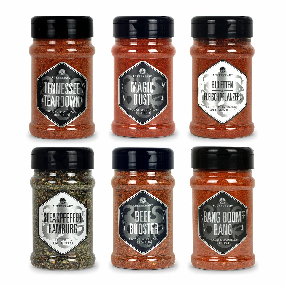 Die Lieblingsbeschäftigung eines BBQ-Fanatikers: Das ganze Wochenende für einen ordentlichen Braten oder einen schöne Leiter Rippchen aufopfern. Von der Selektion beim Schlachter über das Marinieren und Einlegen bis hin zum stundenlangen Smoken im Grill und regelmäßiger Temperaturüberprüfung. Beim Marinieren kommt dieses Set mit ins Spiel: Mit diesen BBQ-Rubs hast du alle wichtigen Trockenmarinaden die zu dieser Grillmethode dazu gehören: Magic Dust & Bang Boom Bang für Spare-Ribs, Tennessee Teardown für Pulled Pork und Chicken-Wings, Beef Booster & Steakpfeffer Hamburg für Brisket und Tri-Tip und das Buletten Gewürz für eine Bacon Bomb.