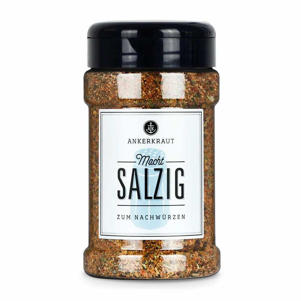 „Macht salzig“ ist unser alltagstaugliches Steaksalz No. 1 . Wenn du die perfekte Veredelung für dein Essen ohne Wenn und Aber suchst, ist „Macht salzig“ die richtige Wahl. Denn darin versteckt sich ein Flockensalz-Hybrid für echte Kenner. In Kombination mit Zwiebel, Knoblauch, Paprikapulver, Pfeffer und sorgfältig ausgewählten Kräutern ist es ein Finisher Salz der besonderen Art, das ohne Umschweife auf den Punkt kommt: salzig, würzig, lecker!