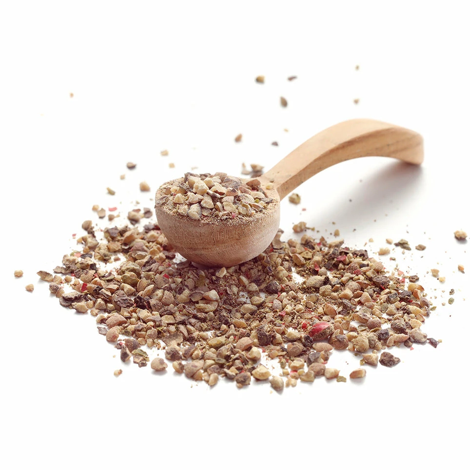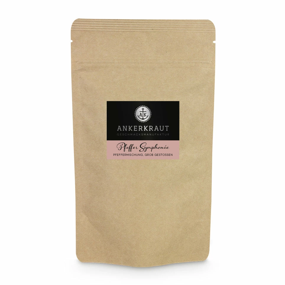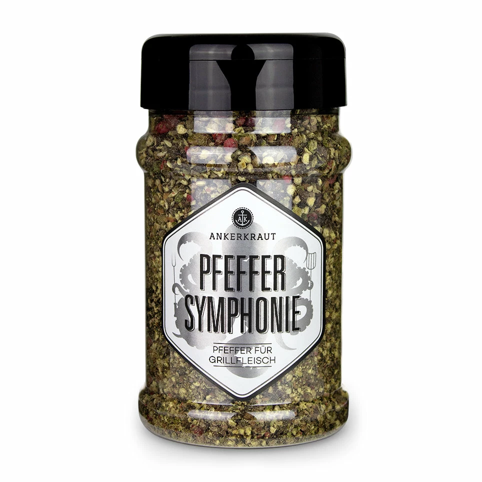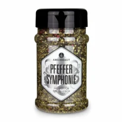 In dieser Pfeffer Symphonie harmonieren verschiedene Pfeffersorten zu einer einzigartigen, reichhaltigen Genuss-Gesamtheit. Weißer Pfeffer, Grüner Pfeffer, schwarzer und Rosa Pfeffer (Schinusbeere: getrocknete Beeren des peruanischen Pfefferbaums) sowie Piment, auch Nelkenpfeffer genannt, sind die Hauptakteure in dieser Symphonie. All ihre Komponenten machen die Mischung zu dem, was sie ist und runden beim Kochen mit einer wohltuenden und würzigen Schärfe ab. Als Steakpfeffer ist diese Kreation mindestens genauso gut geeignet wie für Soßen und Suppen!