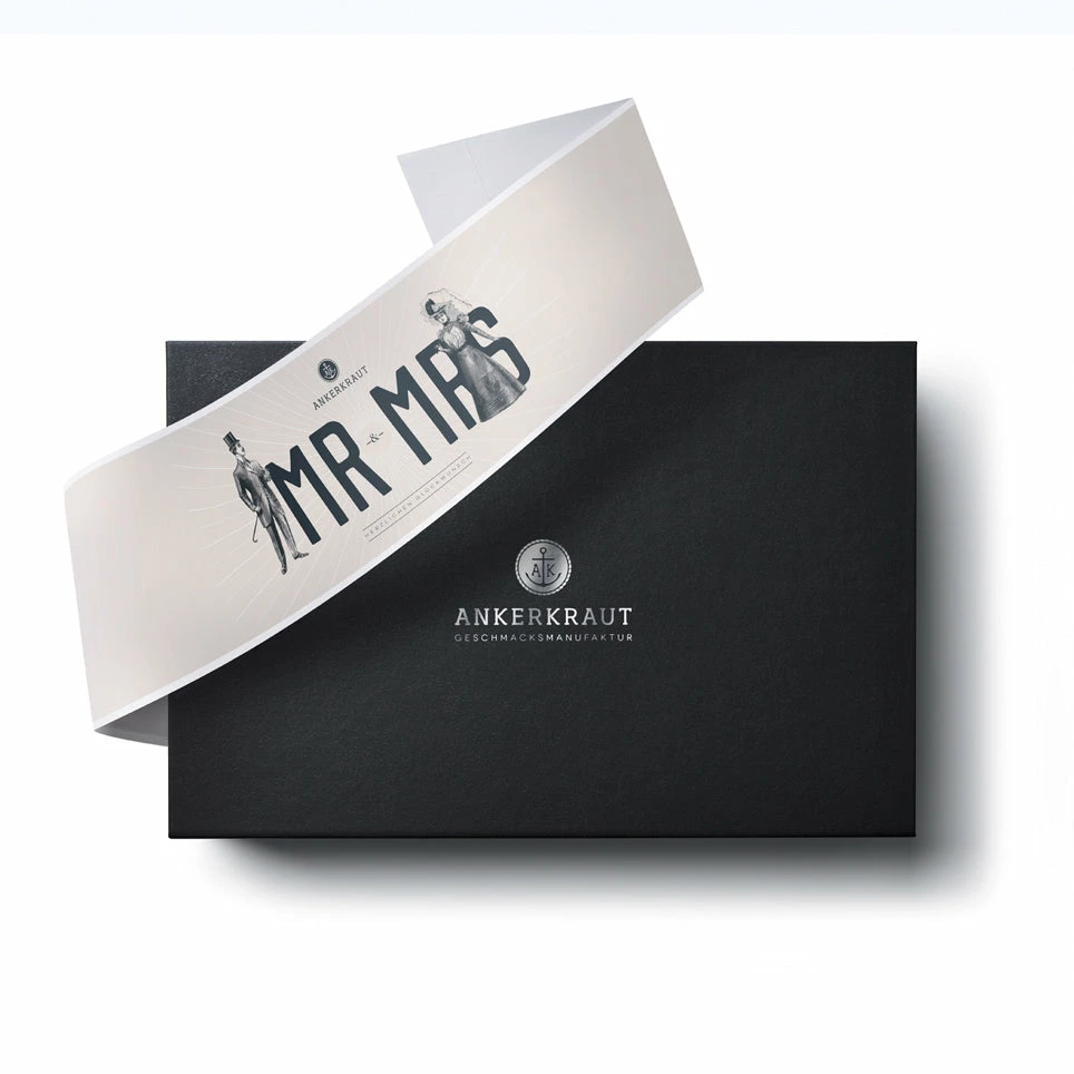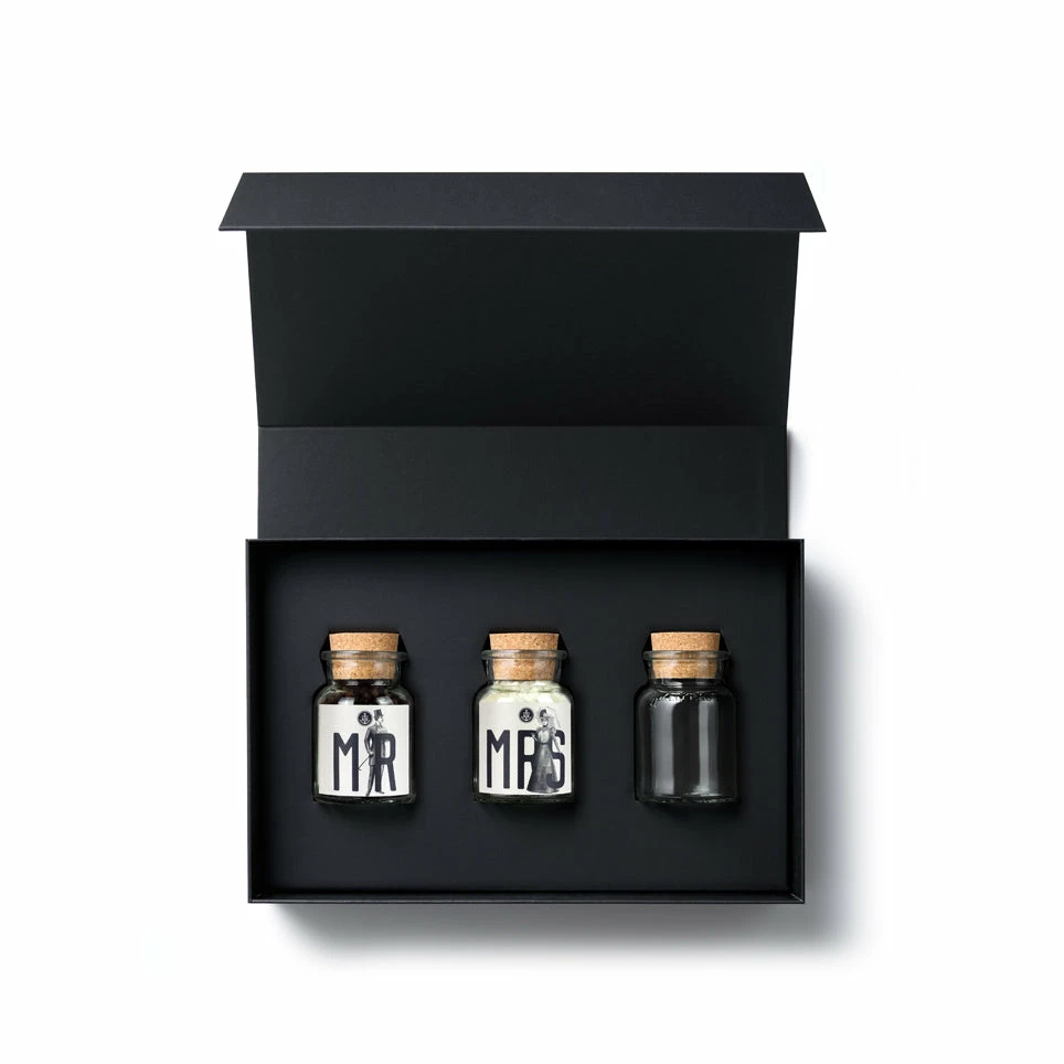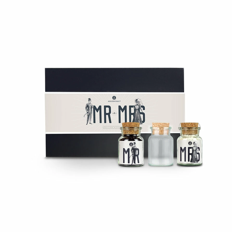 Wenn eine Mrs. und ein Mr. sich gefunden haben, ergänzen sie sich wie das Salz den Pfeffer und der Pfeffer das Salz. …Schluss mit der Romantik! Das tolle an diesem Hochzeitsgeschenk ist: Es sieht gut aus, macht sich gut in der Küche der frisch vermählten und kann Dank eines dritten leeren Korkenglases um den einen oder anderen Euro aufgestockt oder mit einer „Flaschenpost“ personalisiert werden. Das Design der Gläser und die Banderole des Geschenks sind passend aufeinander abgestimmt.