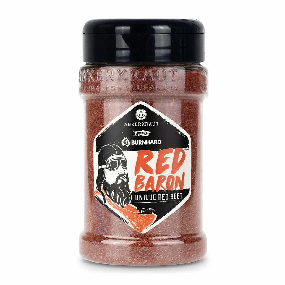 Freddi vom Grillzubehör-Meister BURNHARD ist selbst großer Fan der spannenden Kombination aus Süßem und Salzigem. Und so hat er es sich zur Aufgabe gemacht, einen solchen, ausgefallenen Rub zusammen mit uns zu kreieren: Geschmack und Farbe sollen dabei selbstverständlich ein echtes Unikat sein: Auffällig und mit nichts zu vergleichen. Im Vordergrund steht das erdige, herzhafte Aroma der Roten Bete, begleitet von rustikalen Nuancen des Cumins, das dem Rub eine gewisse Tiefe verleiht. Süße und Schärfe – alles in einem, mehr geht nicht! Besonders geeignet ist der Red Baron mit definitivem Alleinstellungsmerkmal für Fleisch, Fisch, Meeresfrüchte, Gemüse sowie Tofu.