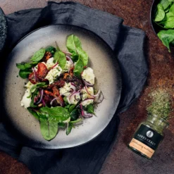 Mit dem Klischee, dass ein Salat nur etwas für Veganer oder Vegetarier ist, wurde schon längst aufgeräumt. Denn wer kein großer Freund von Gemüse und Fleischverzicht ist, hat die Möglichkeit, seinen Salat nach den eigenen Vorlieben zu gestalten, damit er auch für den großen Hunger geeignet ist: Gegrilltes Hähnchenfleisch, Penne, Schafskäse, Oliven und knusprige Croûtons sind nur einige der Zutaten, die ideal zu diesem mediterranen Gewürzmix passen und aus der blättrigen Grünspeise eine vollwertige Mahlzeit machen. Also von wegen fad oder langweilig, ein Salat kann ein wahres Wunderwerk mit jeder Menge Würze sowie Sättigungscharakter sein.