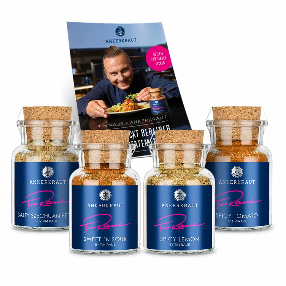 Tauche mit diesem Set mit unseren Tim Raue Gewürzen in die aufregende Welt der Aromen ein! Im Set bekommst du die stylischen Gläschen von Spicy Tomato, Salty Szechuan Pepper , Spicy Lemon und Sweet n Sour – die gehören einfach ins Gewürzregal! Im Set inklusive: ein Rezeptheft mit je zwei passenden Rezepten zu jedem Gewürz.